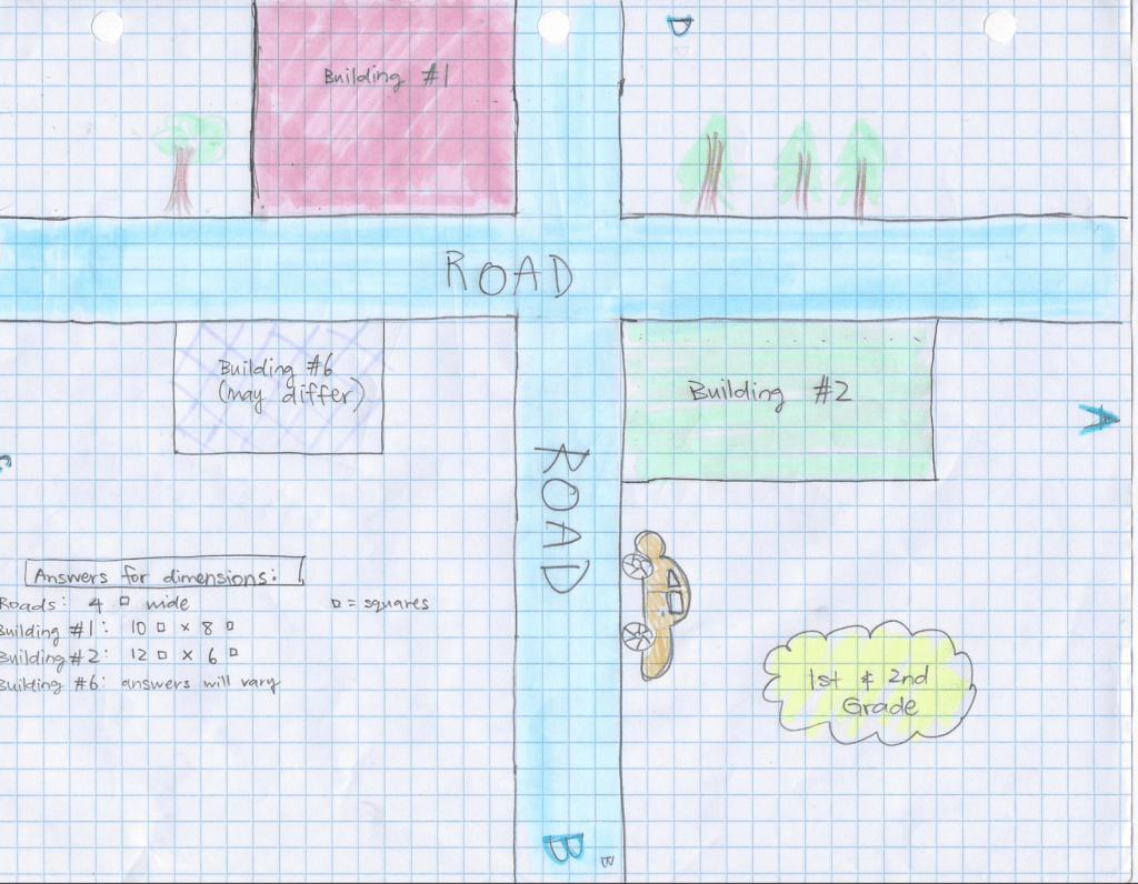 Students create city layouts with buildings based on specific dimensions. These dimensions, based on math facts, allow students to plan out locations of their own shopping malls, pet stores, or whatever establishment they desire.